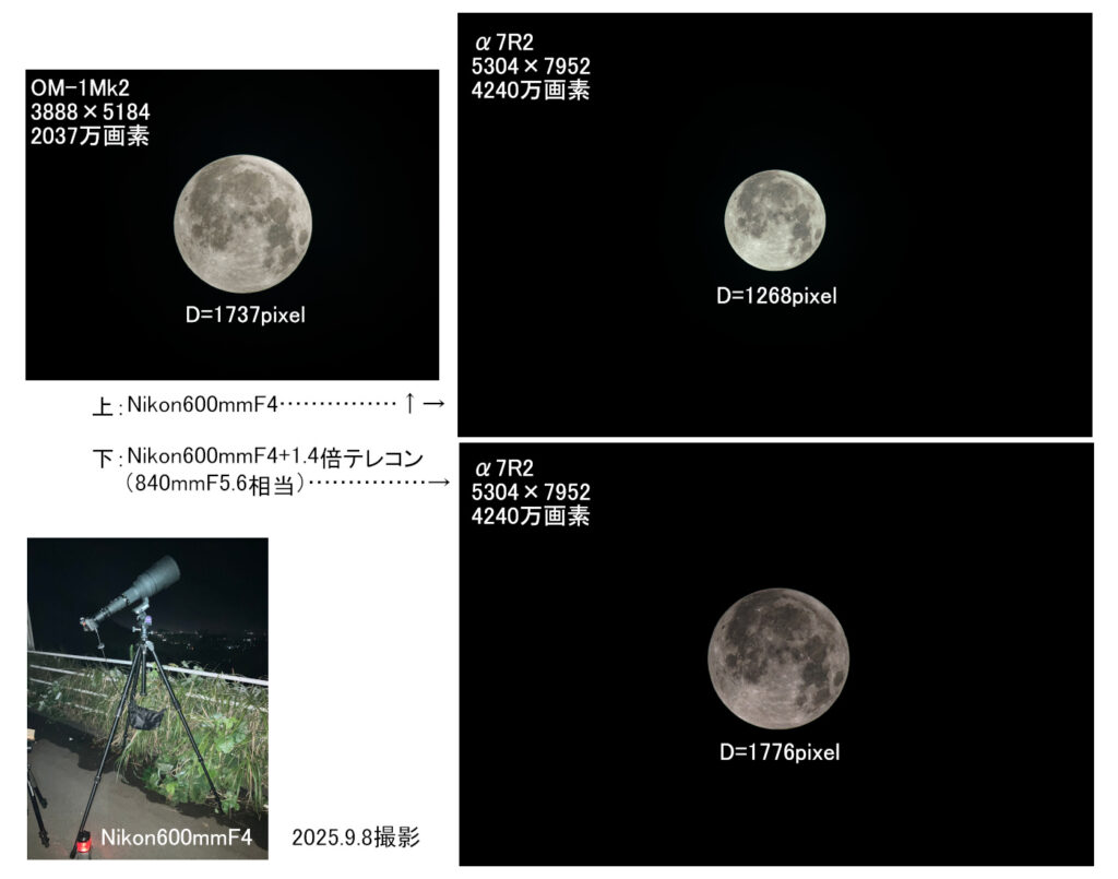 例えば焦点距離600mmの超望遠レンズを用いて満月を撮影する場合を比較しましょう。